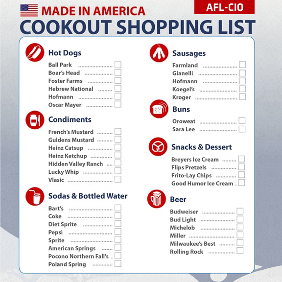 What’s more patriotic than celebrating Independence day with made-in-America, union-made products? Supporting good American jobs is easy–just refer to this union-made shopping list for your BBQ or get-together, brought to you by Labor 411 and the AFL-CIO!
